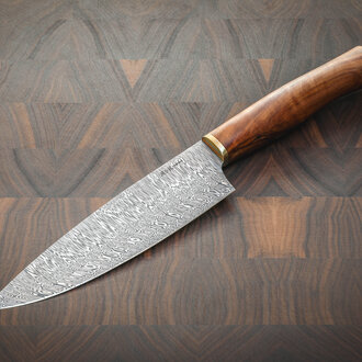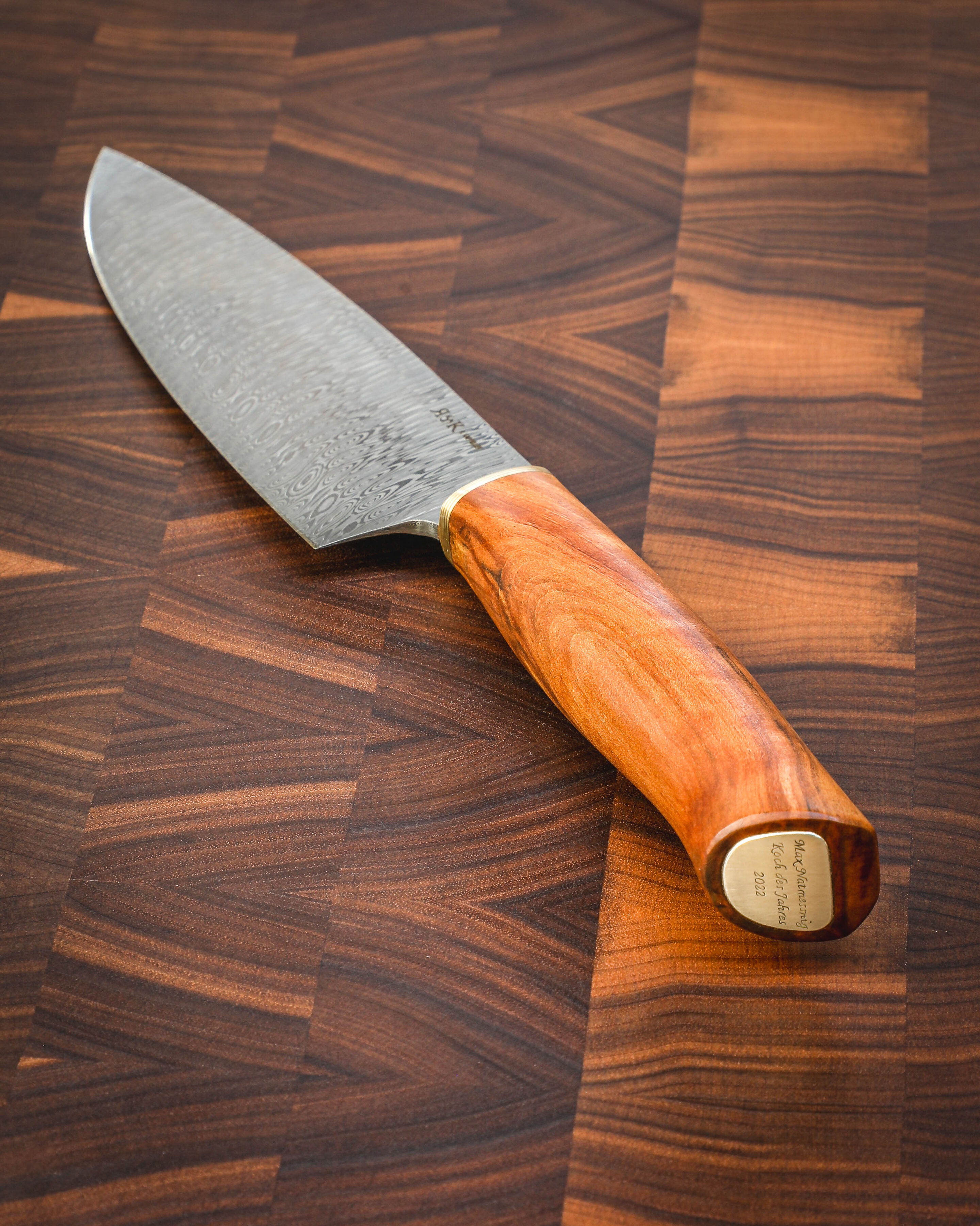 Da wir erfahren haben, dass unser Koch des Jahres 2022, Max Natmessnig aus Niederösterreich stammt, wurde Marillenholz als Griffmaterial gewählt. Das Marillenholz in seiner ruhigen Ausstrahlung verbindet sich perfekt mit dem stark gemaserten Damaststahl.