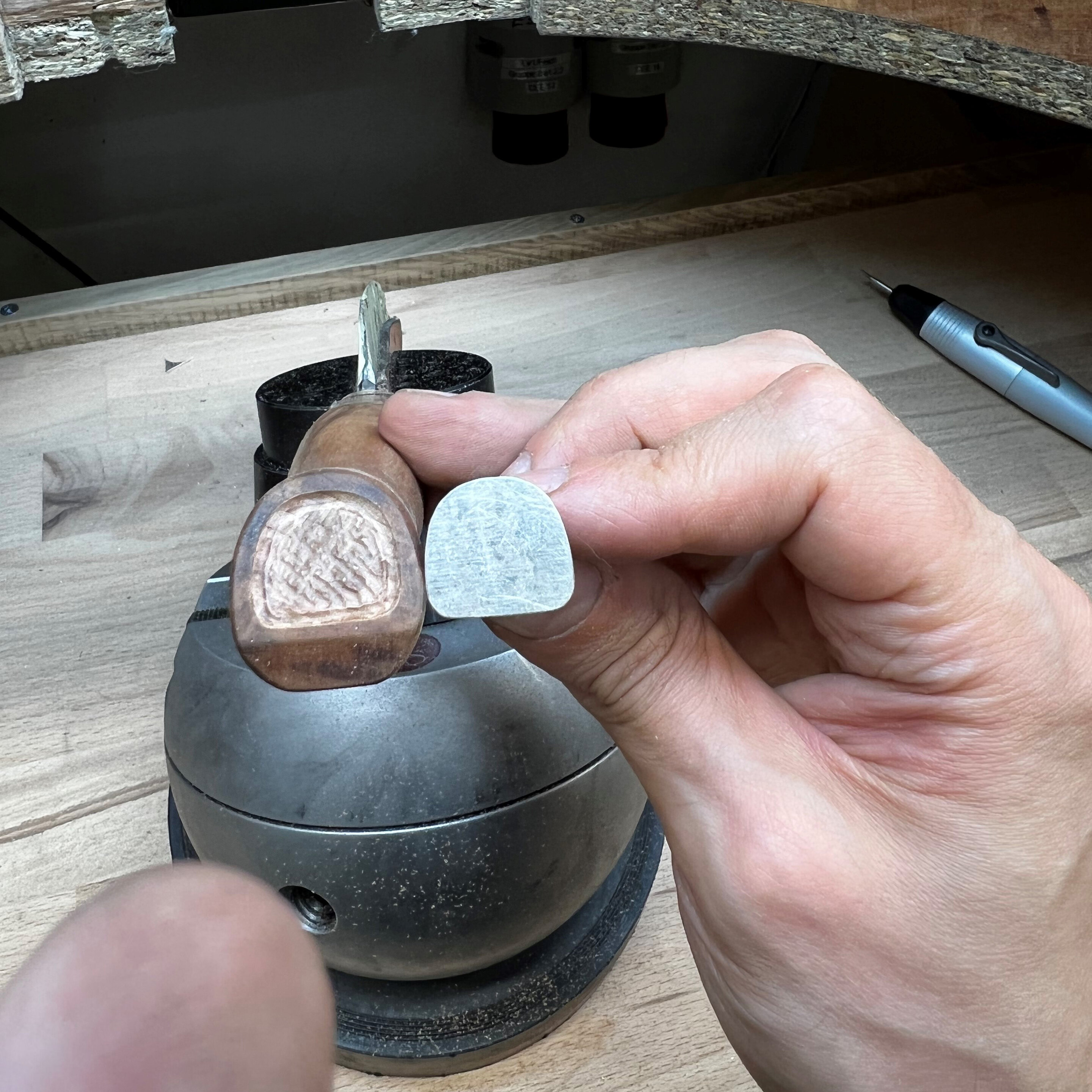 Die unter dem Mikroskop handgestochene Gravur wirkt deutlich natürlicher und edler als eine Maschinengravur. Bei der Handgravur können die Kanten viel exakter gestochen und Schwünge mit mehr Eleganz versehen werden. Im Gegensatz zur Maschinengravur muss kein Eckenradius beachtet werden und so können viel feinere Schriftzüge auf dem Werkstückt umgesetzt und graviert werden.