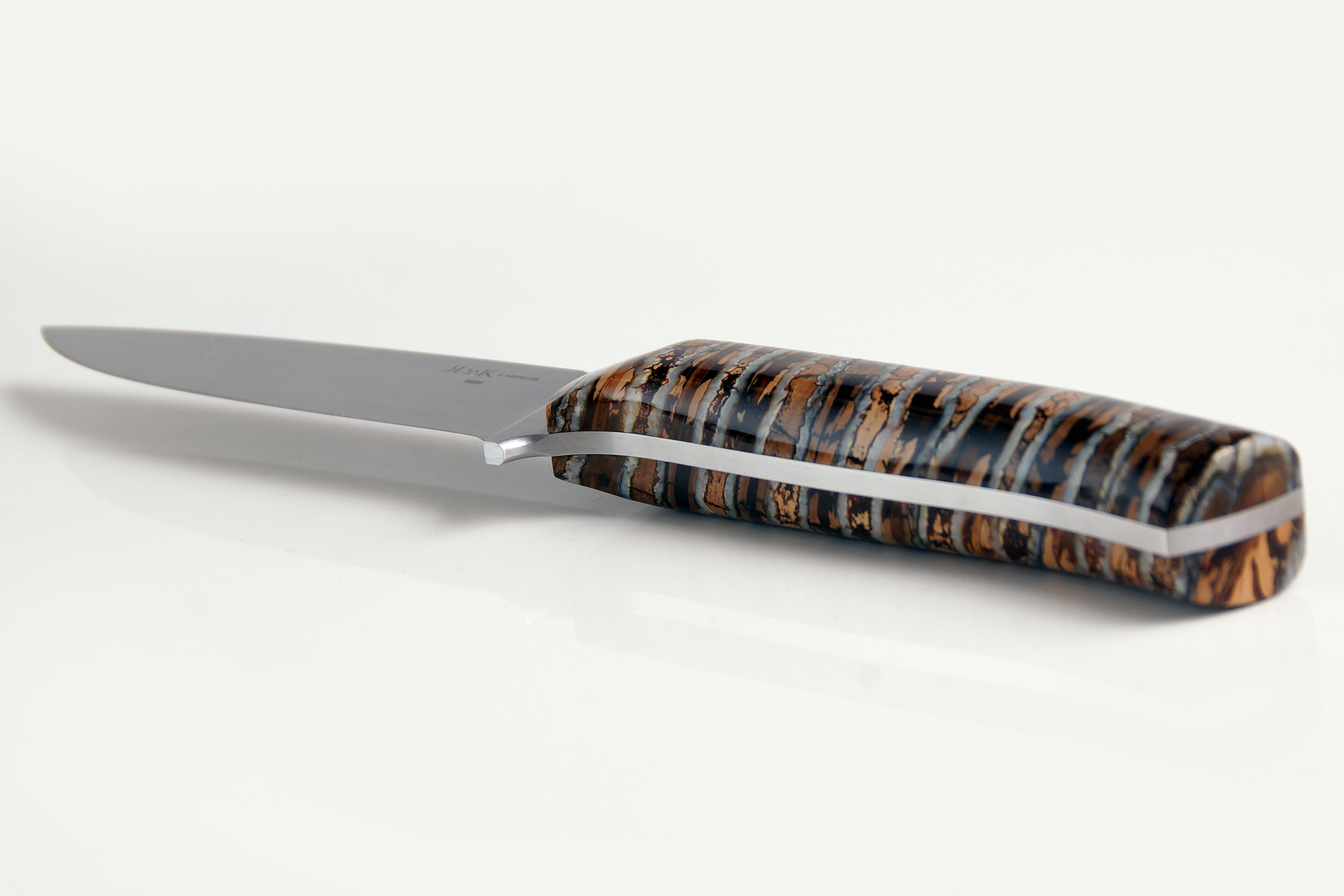 Allrounder featuring a mammoth-tusk handle. Rivets are hidden to not interfere with texture of handle material.