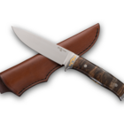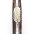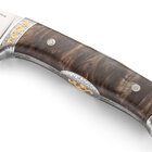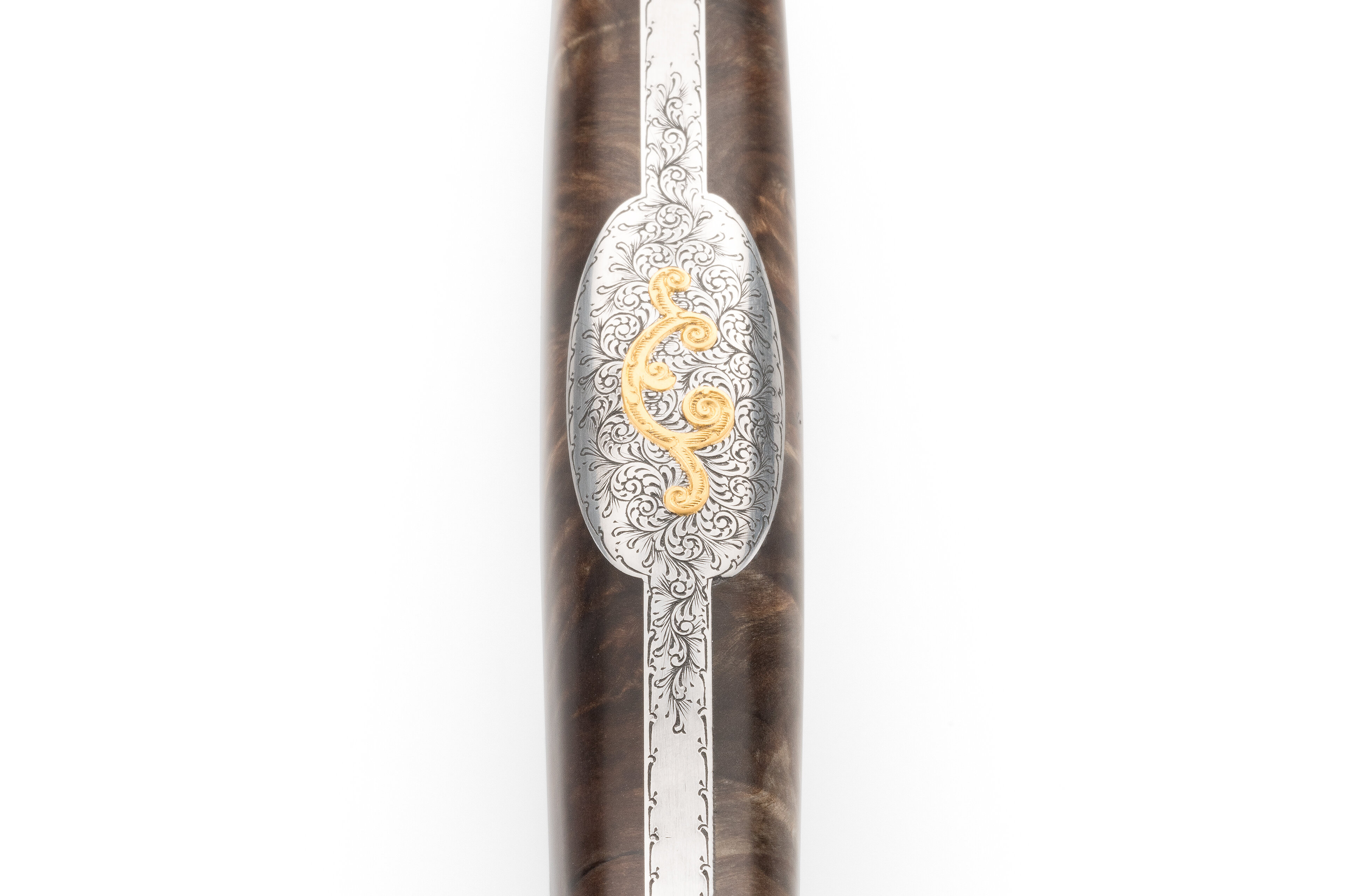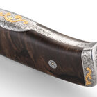 This knife with a stabilised maple burl handle has been refined with numerous details, with engraver Franz Haas, who specialises in hunting weapons, contributing his wealth of experience. The hand guard, tang, and pommel as well as the rivets are decorated with a fine arabesque engraving with sculpted fine gold inlays.
