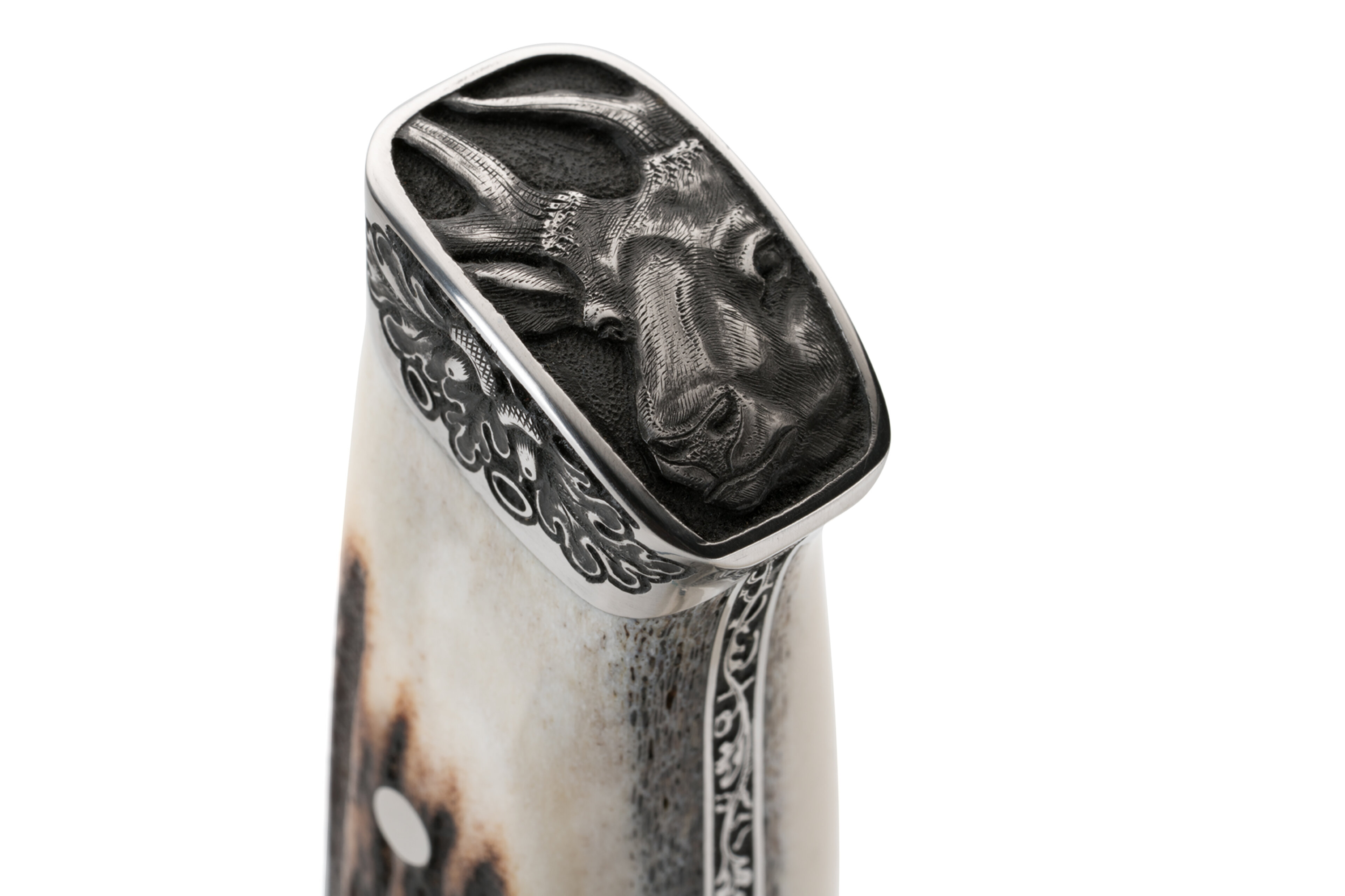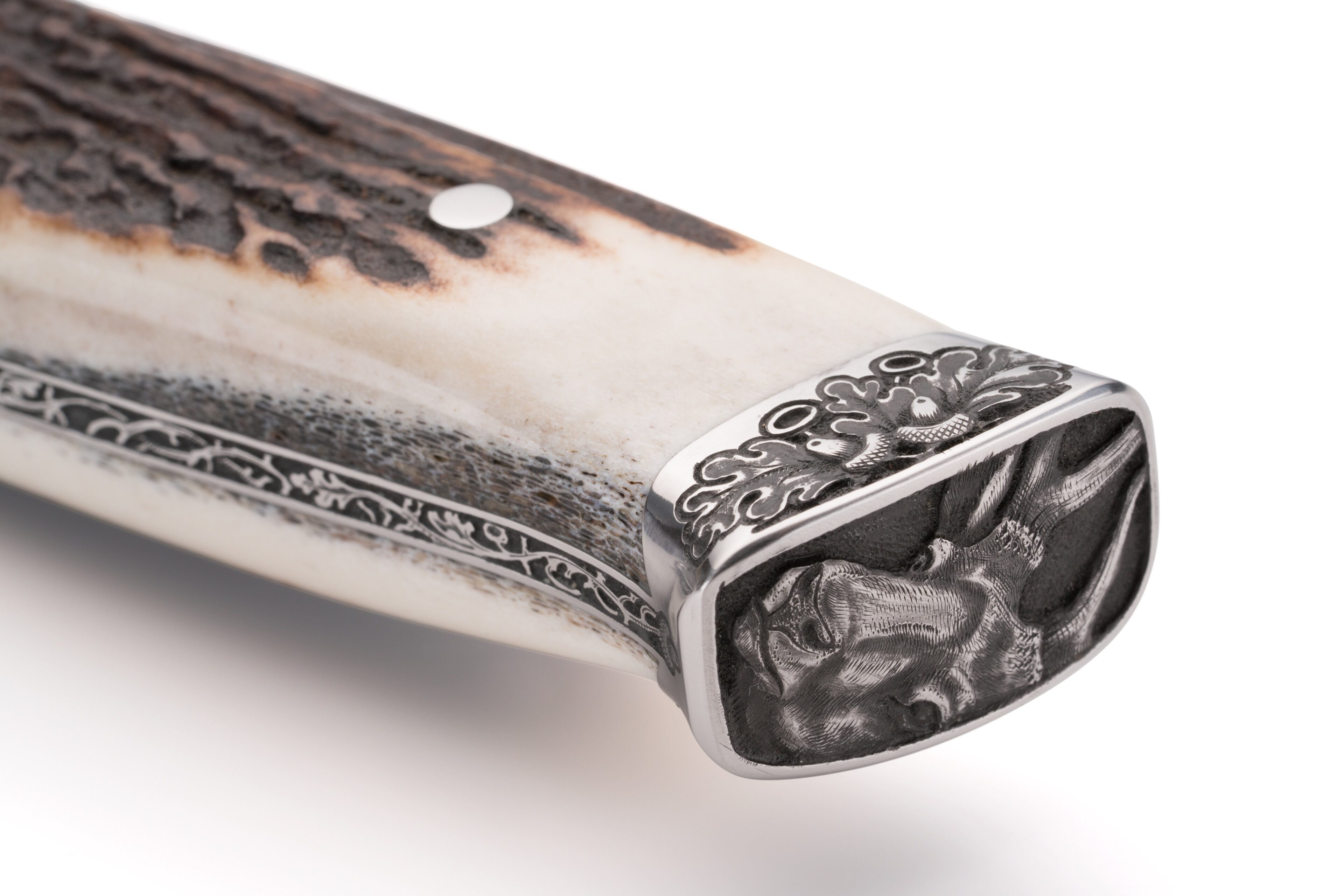 Imrpessive sculptural deep-engraving by Franz Haas. On the handguard a stag during rut on the opposite side a doe. Tang as well as butt sides are covered with oakleaf ornaments. On butt end you find another stag-motif.