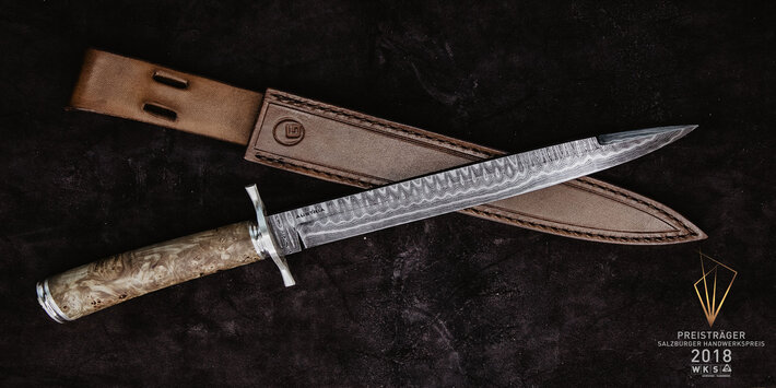 Gesamtlänge: 320 mm Klingenlänge: 195 mm Klingenstahl: handgeschmiedeter Mehrlagenstahl mit Nickel-Zwischenschicht Griffmaterial: stabilisierte stockige...