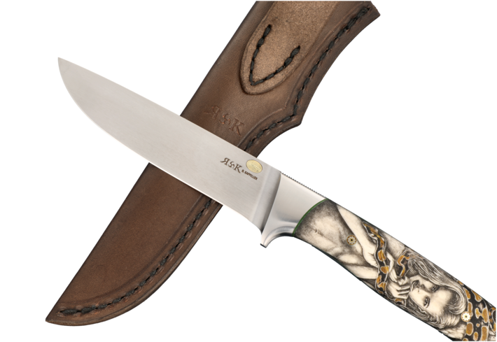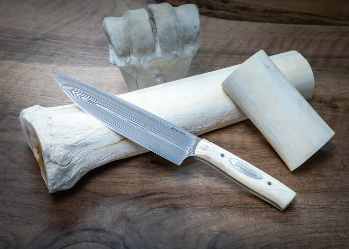 Bei diesem Vollintegralmesser mit geschwungener Angel wurde der Mammut-Elfenbein-Griff in mehrfärbiger Scrimshaw-Technik gefertigt - ein aufwändiges ELEGANCE-Unikat aus...