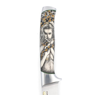 Warum gerade Adam & Eva? Die geschwungene Angel des ZUNFT-LINIE ELEGANCE hat Richard immer schon an die Bewegung einer Schlange erinnert - und von der Schlange ist es nicht weit ins Paradies und zur Geschichte von den ersten Menschen, die Gott schuf. Um diese Idee farblich zu akzentuieren, hat er den Elfenbein-Griff mit einer grünen Edelharz-Schicht unterlegt und durch das Rot des Apfels in Adams Hand und das Gelb des Pythons an Evas Hals kontrastiert.