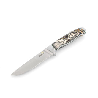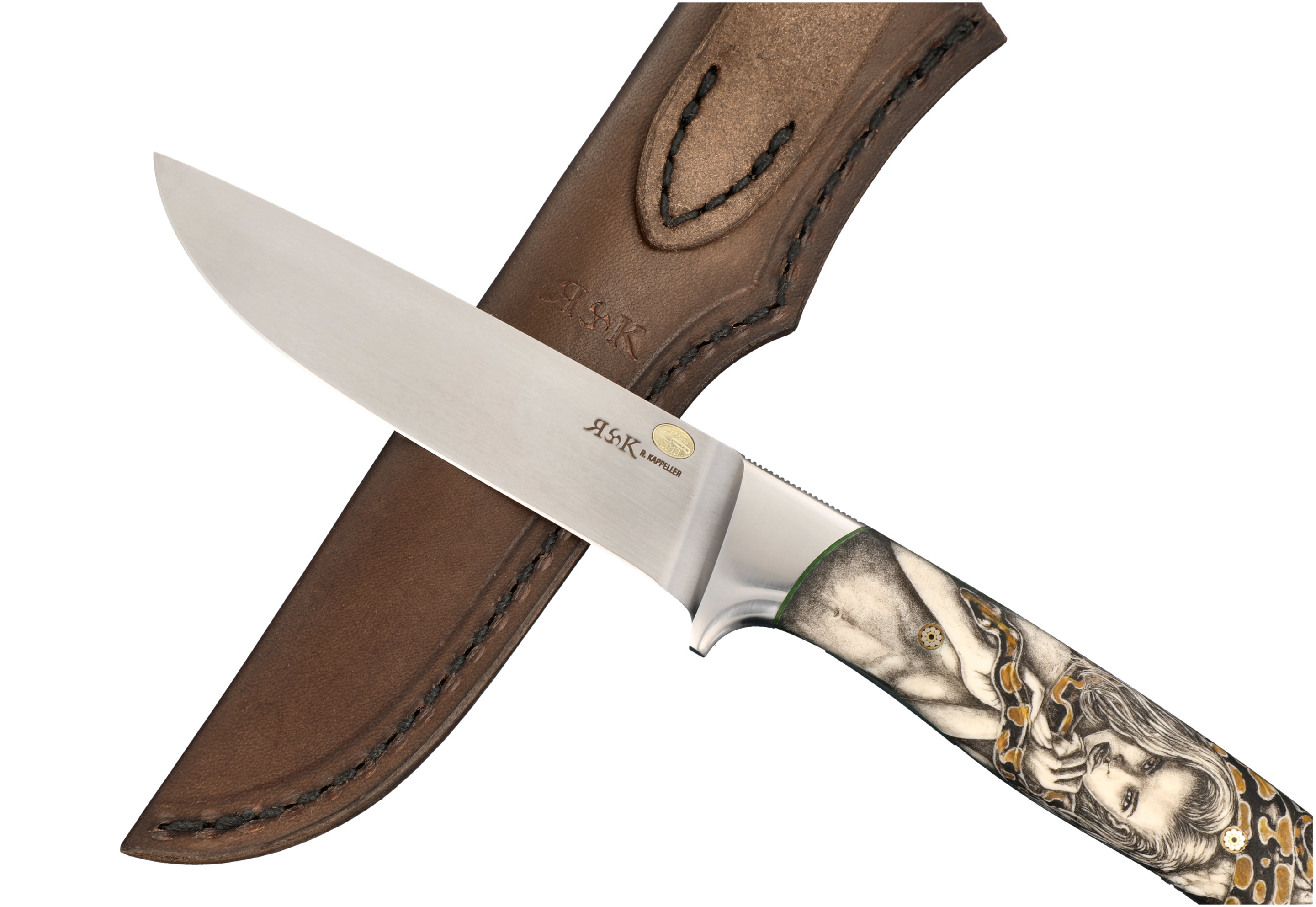 Bei diesem Vollintegralmesser mit geschwungener Angel wurde der Mammut-Elfenbein-Griff in mehrfärbiger Scrimshaw-Technik gefertigt - ein aufwändiges ELEGANCE-Unikat aus unserer limitierten ZUNFT-LINIE.