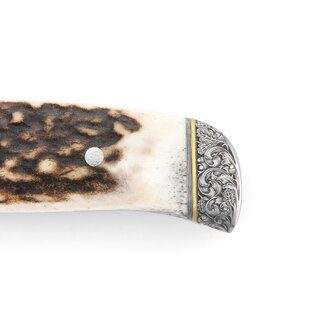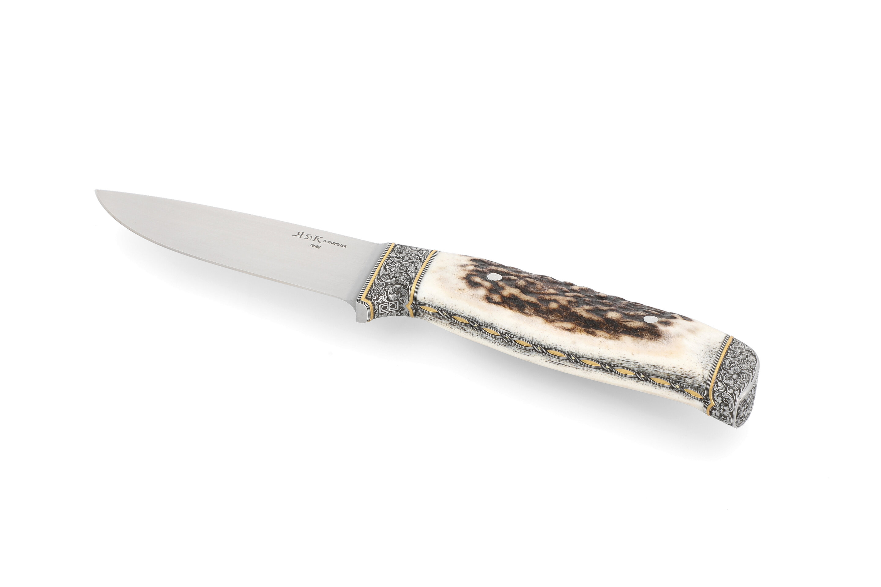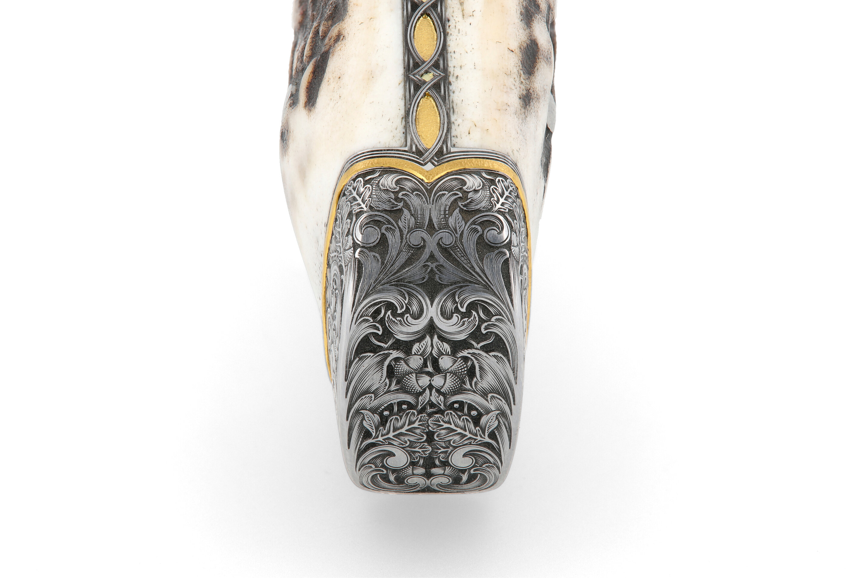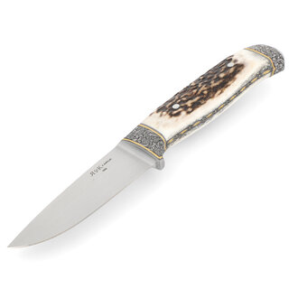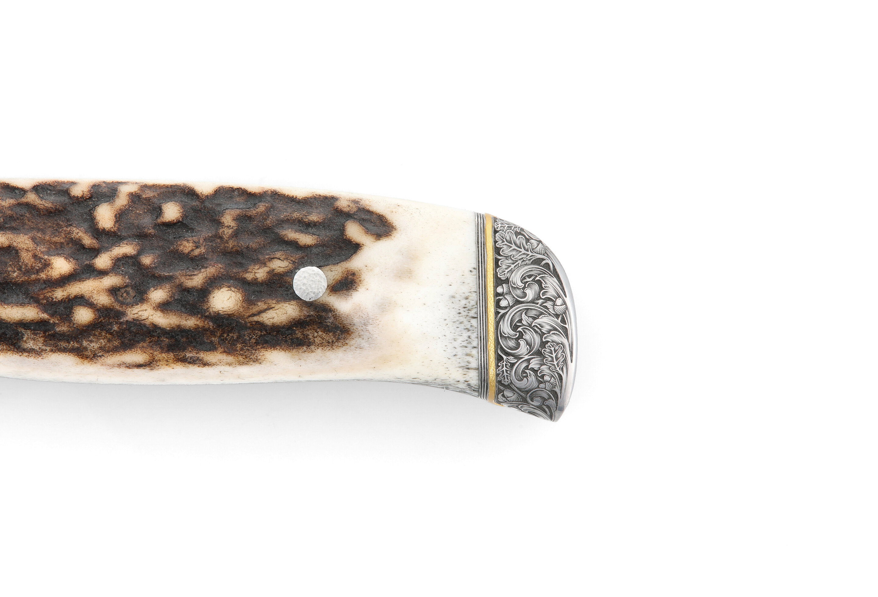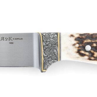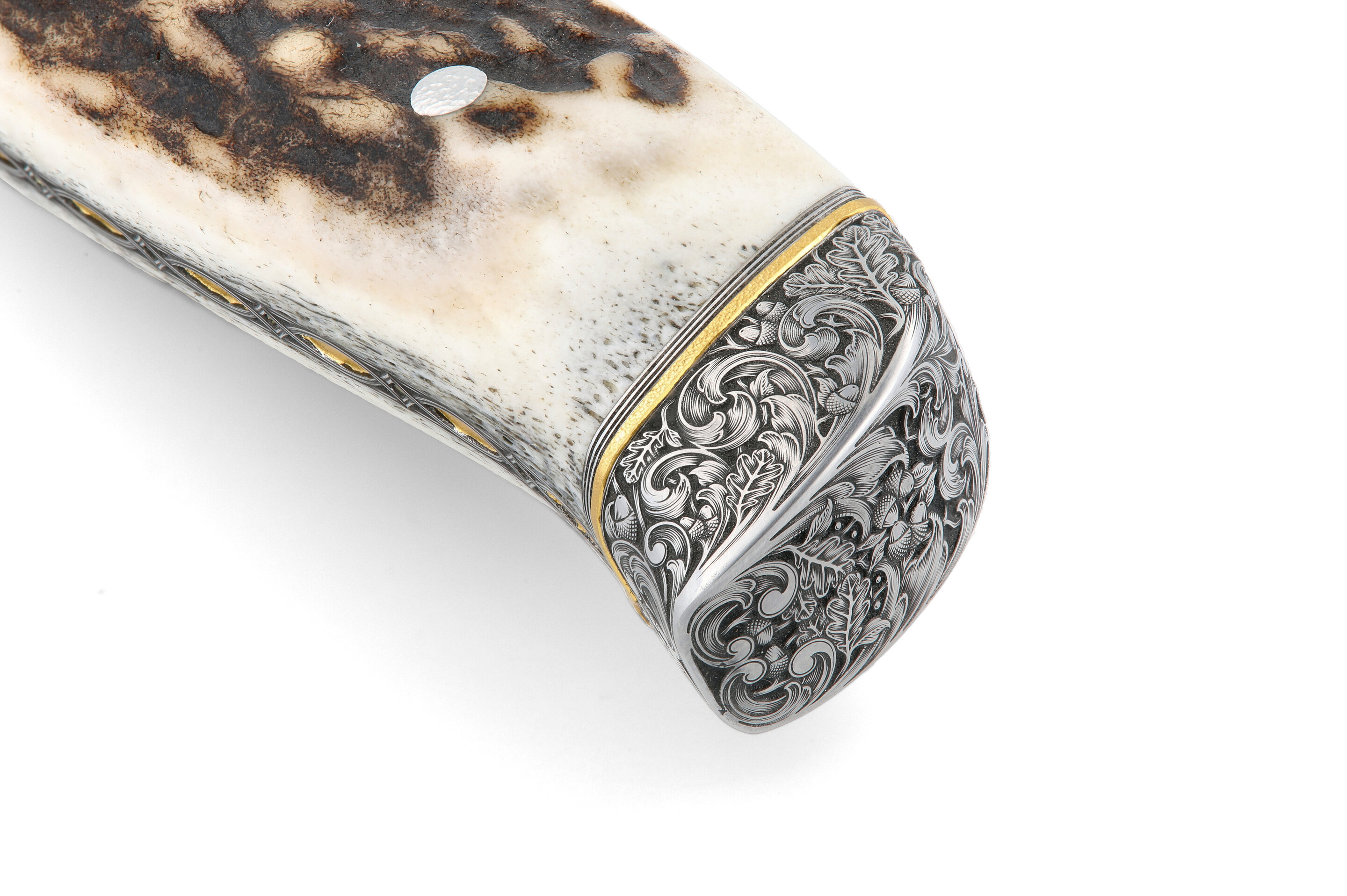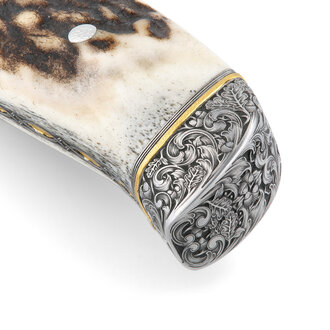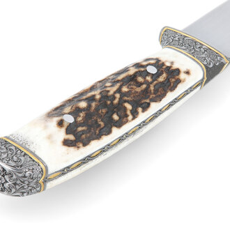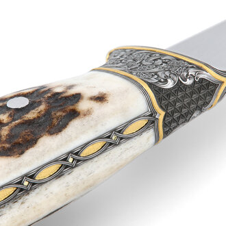 Die Klinge in Vollintegralbauweise besteht aus Böhler N690 und der natürliche Griff aus Hirschgeweih. Die Nieten wurden oberflächlich strukturiert, um optisch mit den plastischen Feingoldeinlagen zu harmonieren.