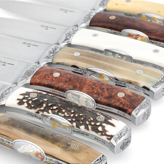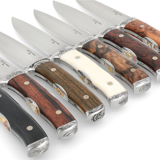 In einem historischen Ornamentbuch stießen Richard Kappeller und der Ferlacher Graveur Daniel Karagiannis auf eine Reihe solcher prachtvoller Schwertabschlüsse. Fasziniert von dem eleganten und ausdrucksstarken Stil, entstand die Idee zu einer eigenen exklusiven Messerserie, die diese historische Vorlage modern interpretiert.