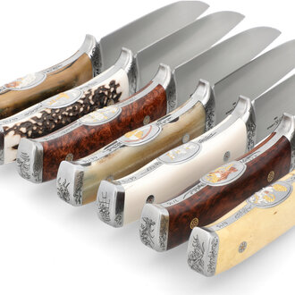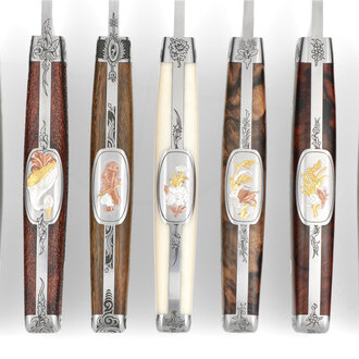 Aus 16 identischen Exemplaren des gleichen Messermodells – Artis Vollintegral – schufen sie 16 Einzelstücke mit unterschiedlichen Griffen und jeweils einzigartiger Handgravur. Angelehnt an die traditionell japanischen Vorbilder, wurden die Motive über Handschutz, Abschluss und Angel der Messer erweitert und in Karagiannis’ eigenem Stil ergänzt. In fruchtbarer Kooperation zwischen Messermacher und Graveur entstanden so 16 exquisite Kunstwerke – eine Fusion von fernöstlichem Flair und österreichischem Touch.