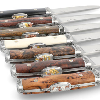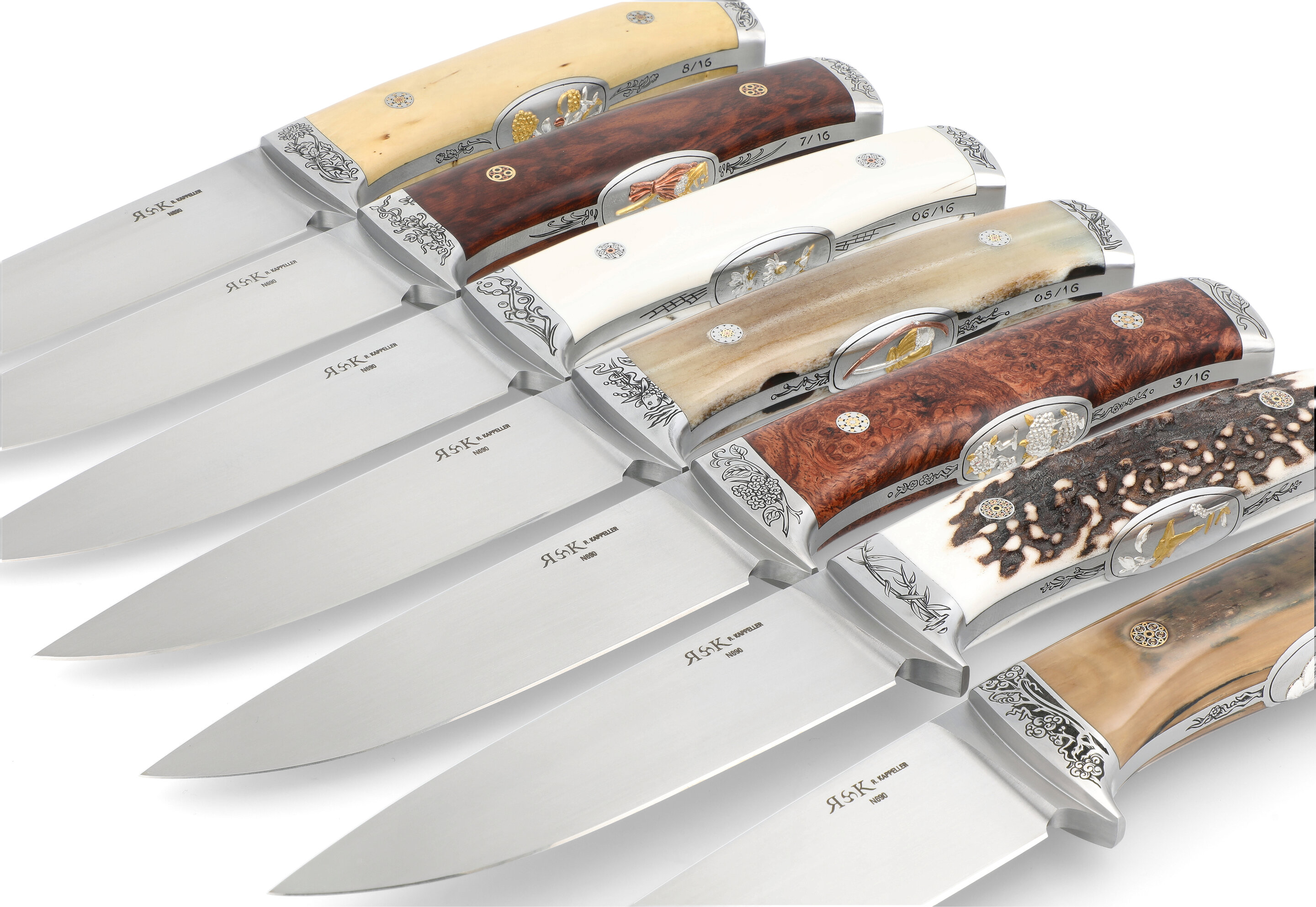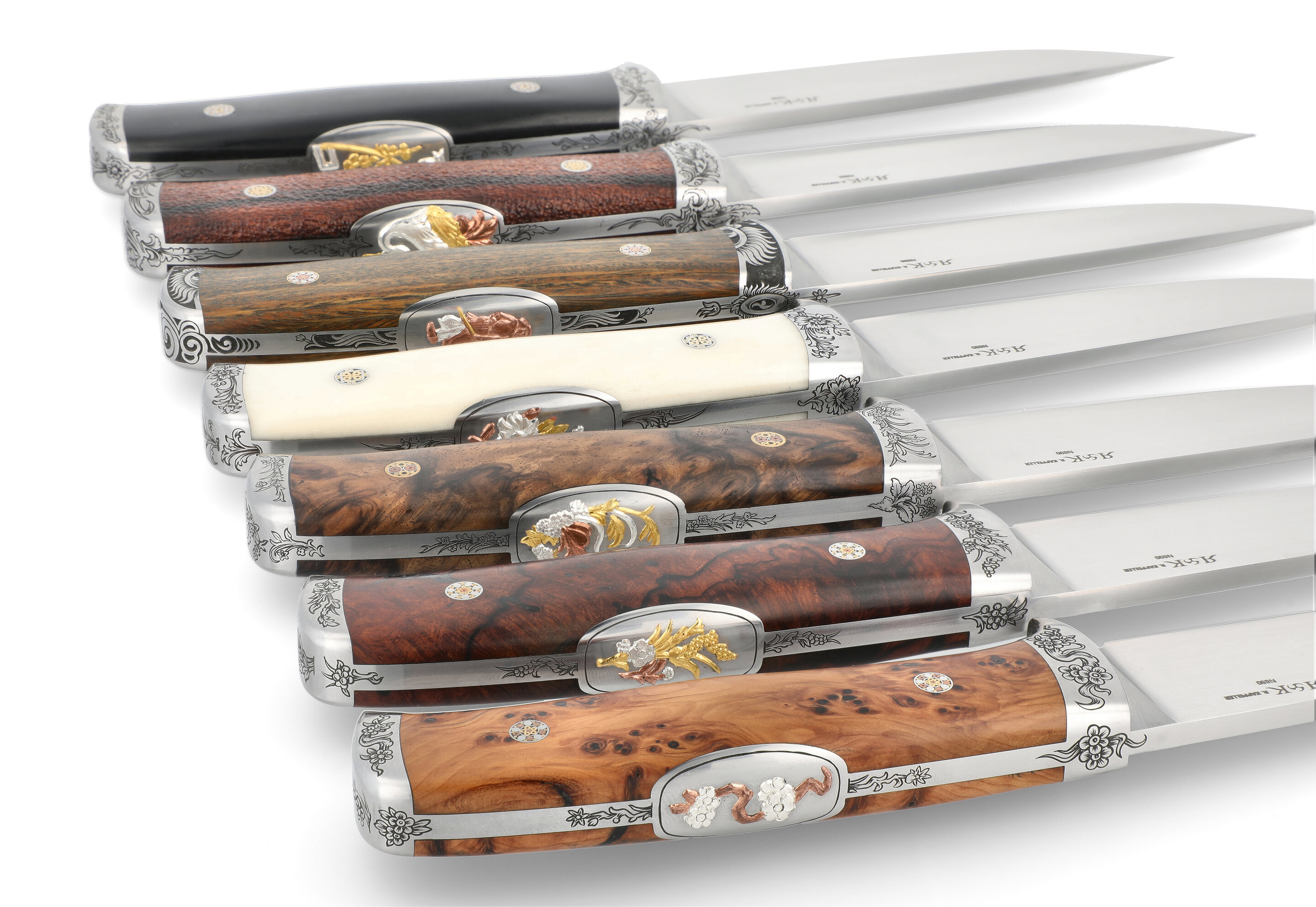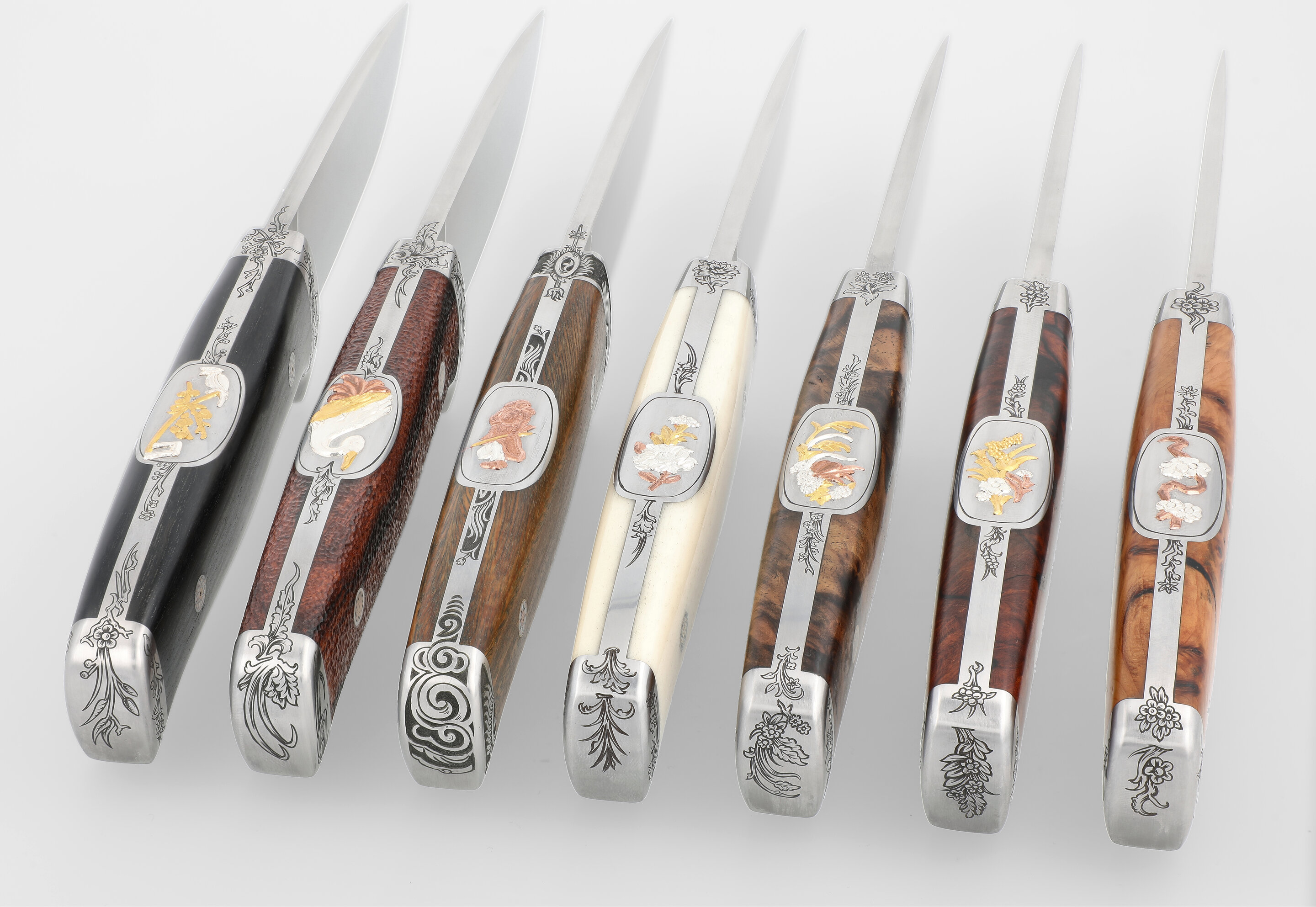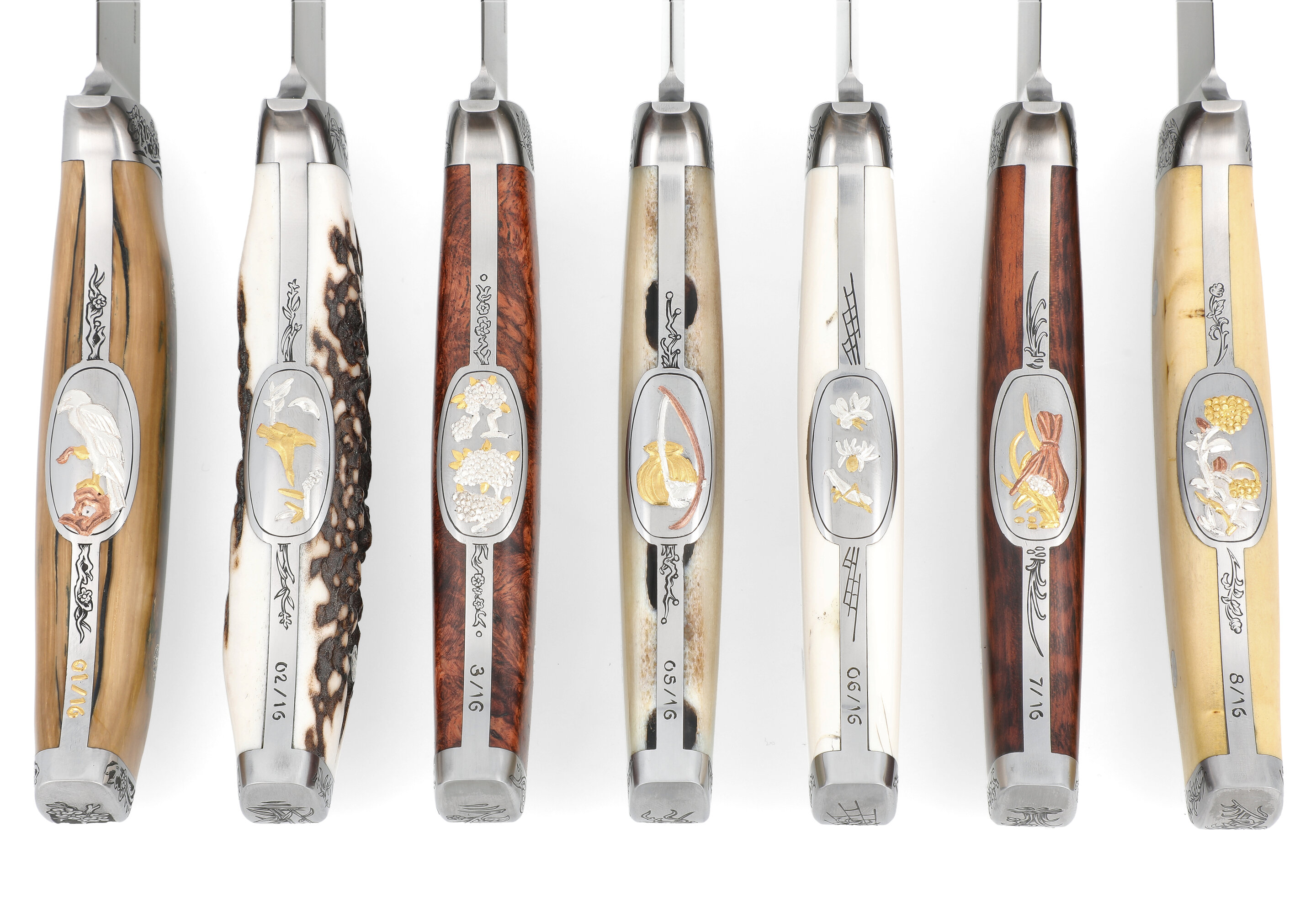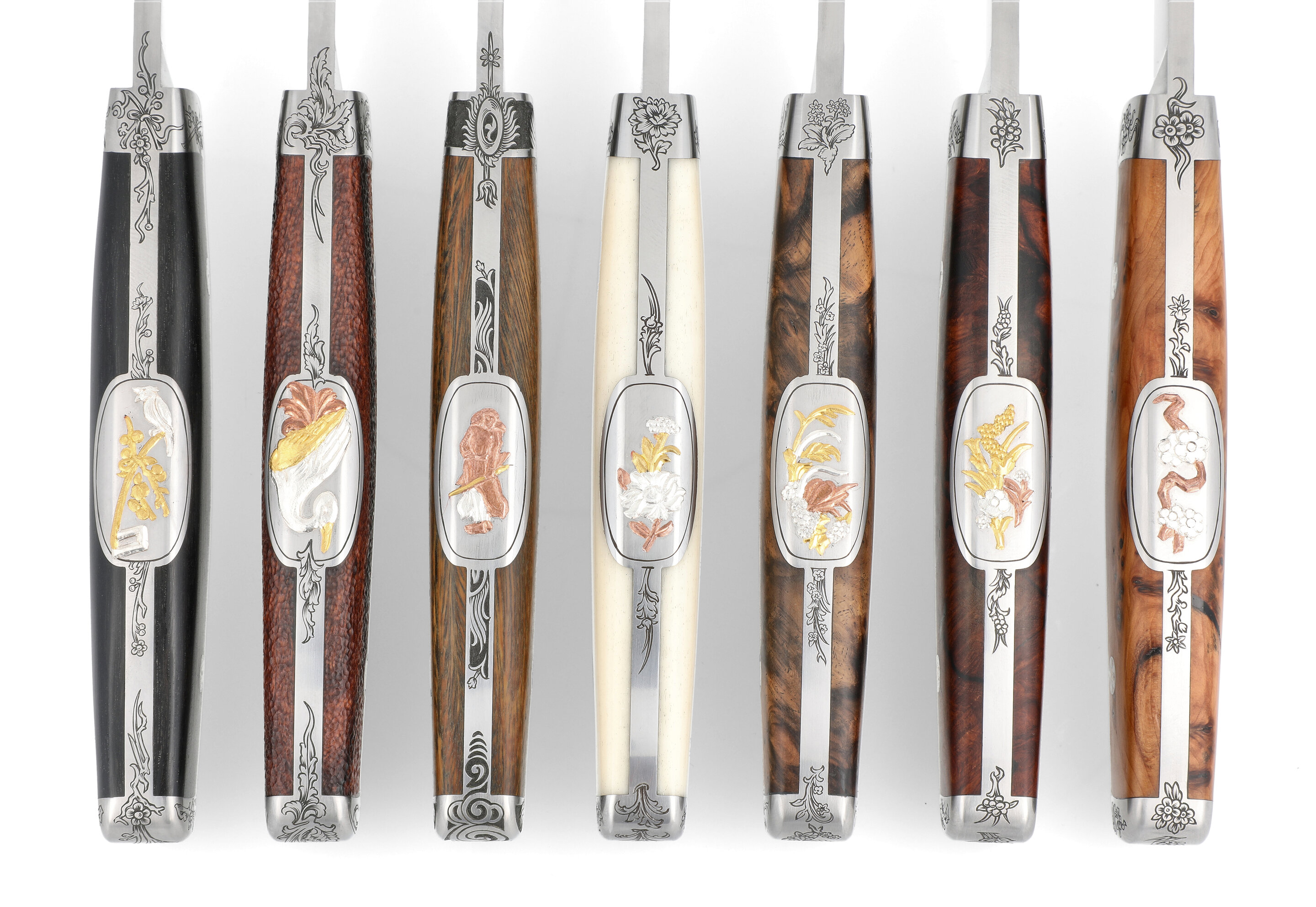 Zuletzt wurden die Messer feingeschliffen, die Griffe poliert und geölt, Edelmetalle eingelegt und die Motive plastisch verschnitten – ein extrem aufwändiger Prozess mit einzigartigem Ergebnis.