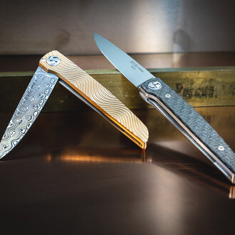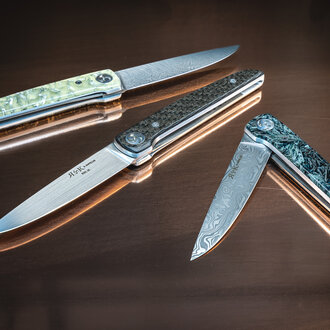 Ob ein fluoreszierendes Griffstück mit Aluspänen oder geschredderten Dollarnoten, schlichtem Carbon oder gemasertem Wüsteneisenholz – all das ist bei der Klappmesserserie Mono möglich. Diese Philosophie des Wandelbaren gilt auch für die Messerklinge, wo vom interessanten Lagendamast bis hin zum rostfreien Edelstahl alles verwendet werden kann.