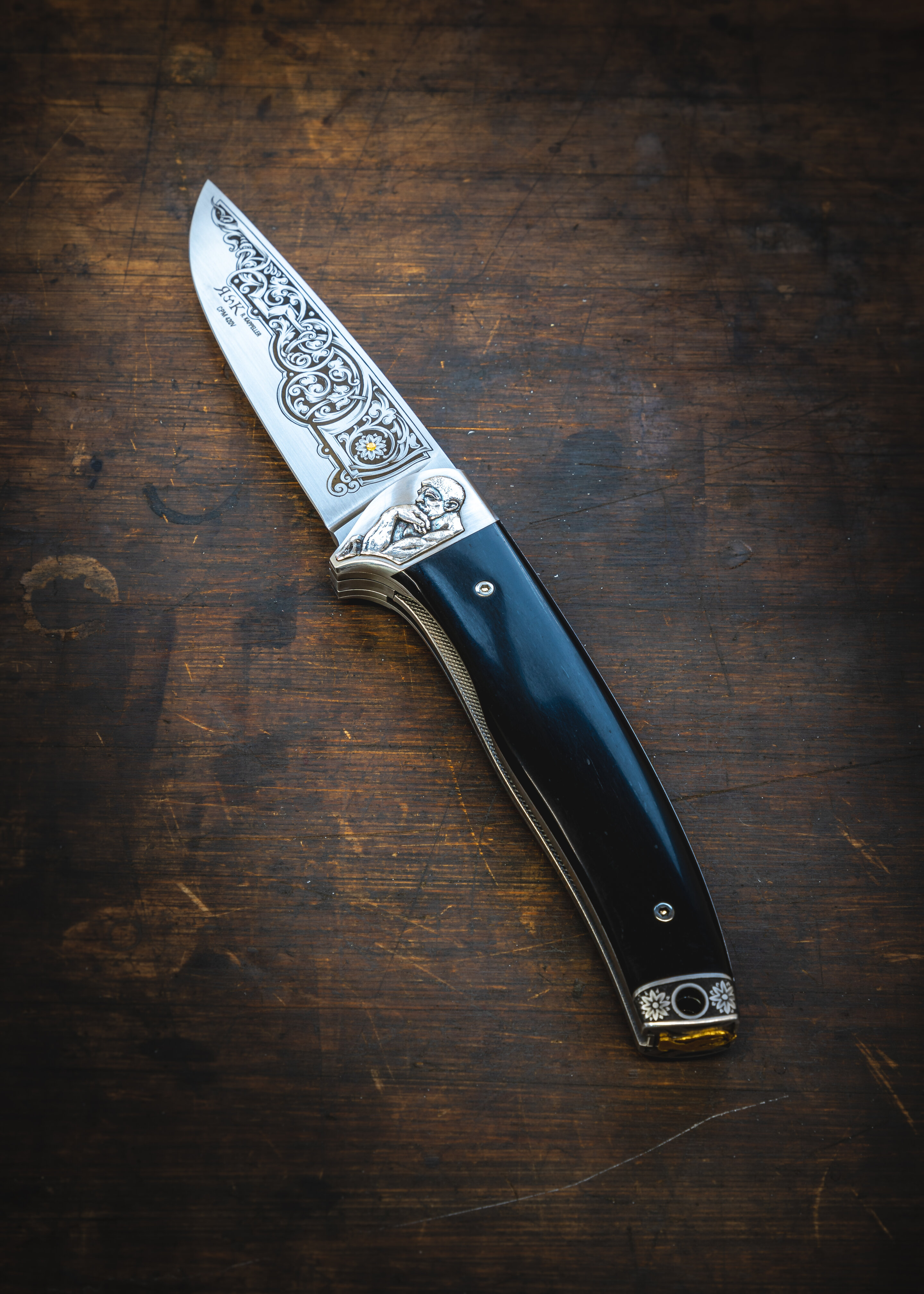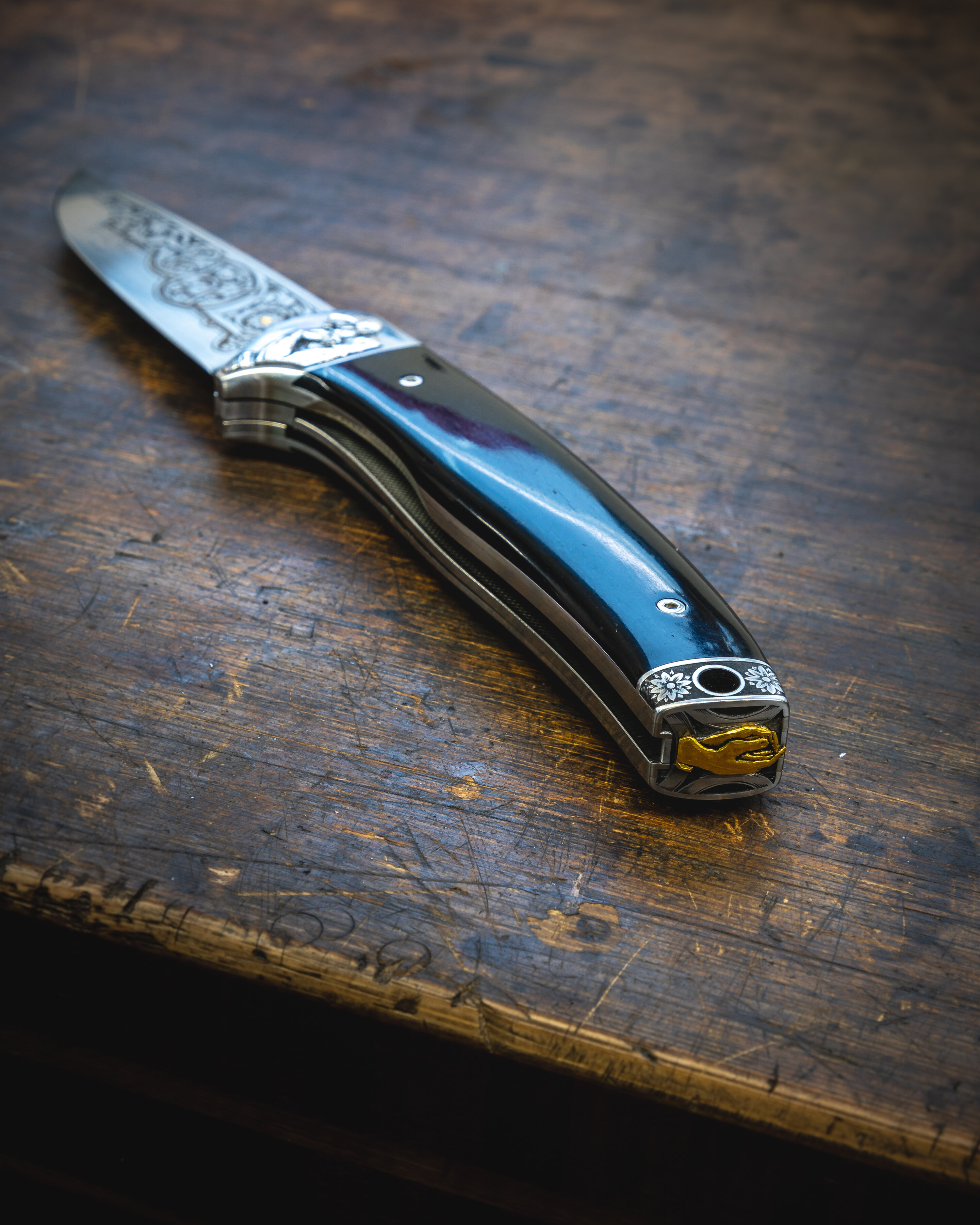Das Messer wurde mit Gold- (Blume mit Goldeinlage auf Messerklinge und goldene Hände am Messerabschluss aus 24 Karat Feingold) und Silbereinlagen (Messerbacken mit gravierter Plastik „Denker“ aus Feinsilber) ergänzt und plastisch ausgearbeitet. Durch präzise Ausfräsungen auf Platinen und Rahmen (fünf Einzelteile) fügen sich die am Keil fixierten goldenen Hände perfekt in diesen besonderen Messerabschluss ein. Dieses aufwendig gestaltete Klappmesser in Rahmenbauweise lässt sich komplett in seine Einzelteile zerlegen.