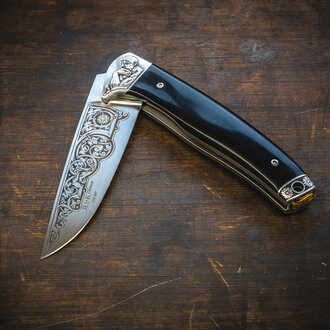 Die Platinen der „Linerlock“ Mechanik wurden aus Titan gefertigt, der Rahmen aus gehärtetem N690 Böhlerstahl. Die tiefschwarzen Griffschalen aus Gagat wurden im 60° Winkel in den Rahmen eingepasst. Die Klinge selbst besteht aus CPM 420V pulvermetallurgischem Stahl, der sich durch seine große Schnitthaltigkeit und hohe Verschleißfestigkeit auszeichnet.