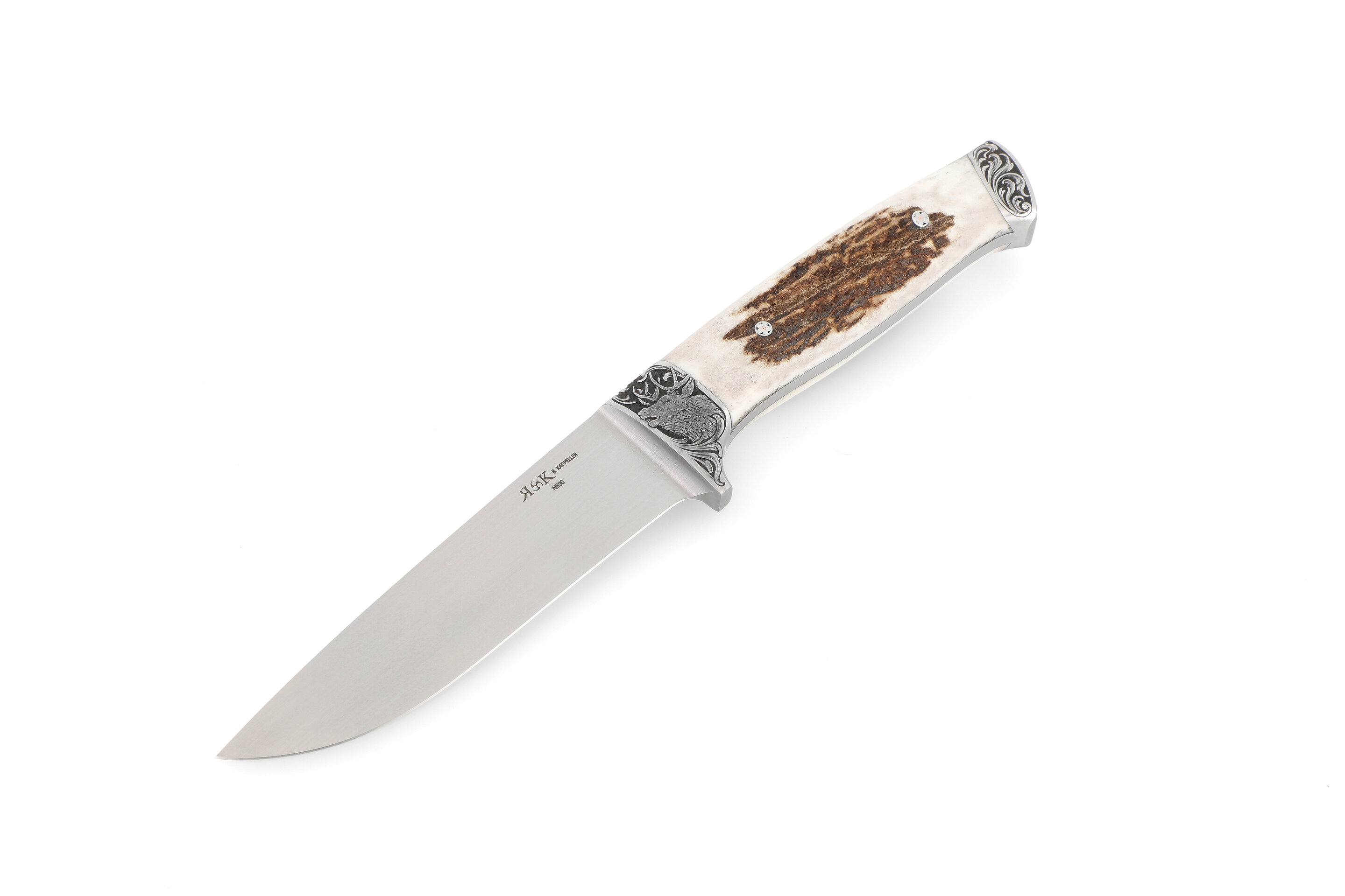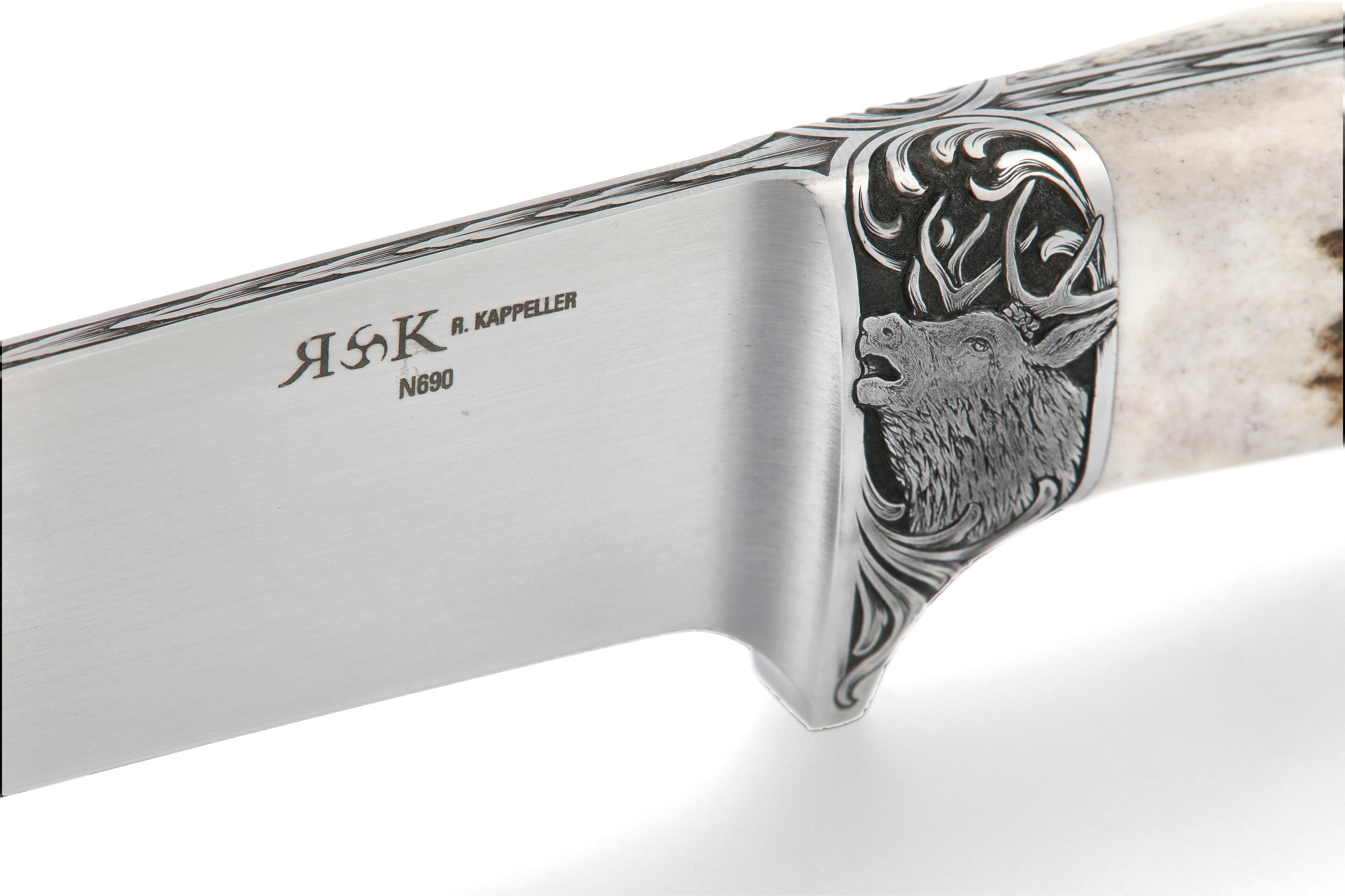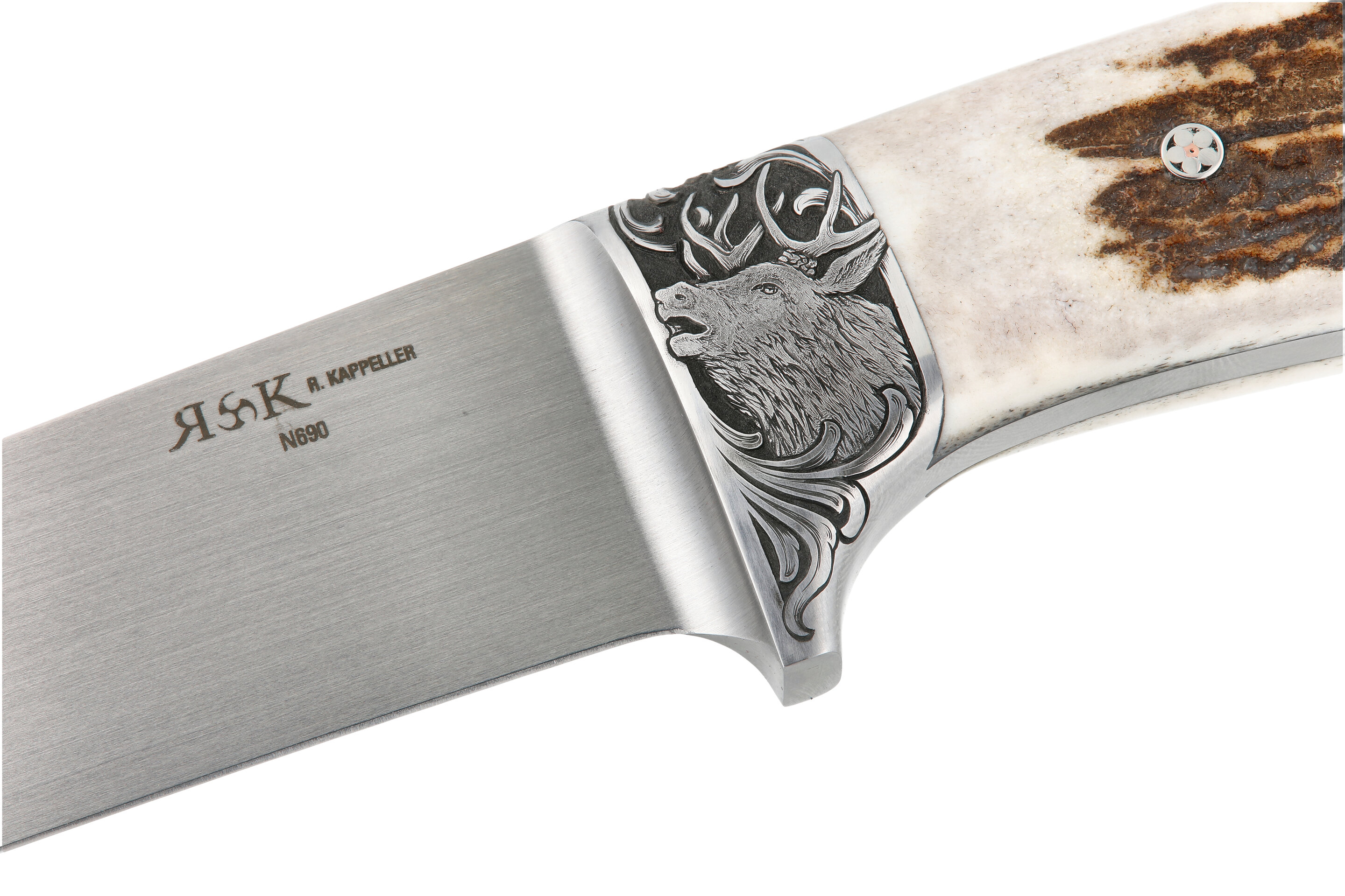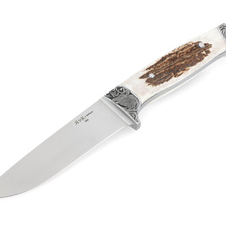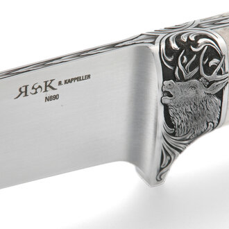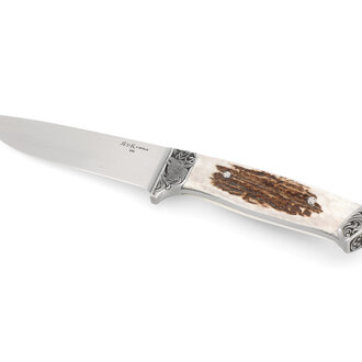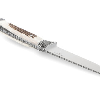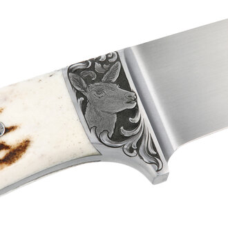 Das Ibex Vollintegral Messer ist ein handgefertigtes Kunstwerk, das traditionelle Materialien, Gravurtechniken und Messermacherkunst miteinander vereint. Der Griff aus Hirschgeweih harmoniert perfekt mit der gravierten Darstellung von männlichen und weiblichen Hirschköpfen, die in klassische ornamentale Muster eingebettet sind. Diese Gravuren wurden unter dem Mikroskop und in präziser Handarbeit angebracht, um höchste Detailtreue zu gewährleisten.