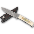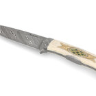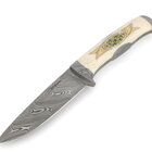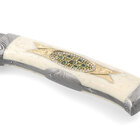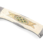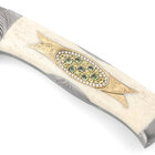 Dieses Vollintegralmesser ist aus einem Stück Torsionsdamast mit sternartigem Muster gefertigt. Im Griff aus Giraffenknochen wurden in einer 750er Gelbgold-Einlage 42 Diamanten, 10 gelbe und 7 grüne Saphire aufwändig gefasst. Für einen brillanteren Glanz erhielt der Hintergrund zwischen den Fassungen einen Glanzstich, die umgebenden Flächen wurden von Hand graviert.