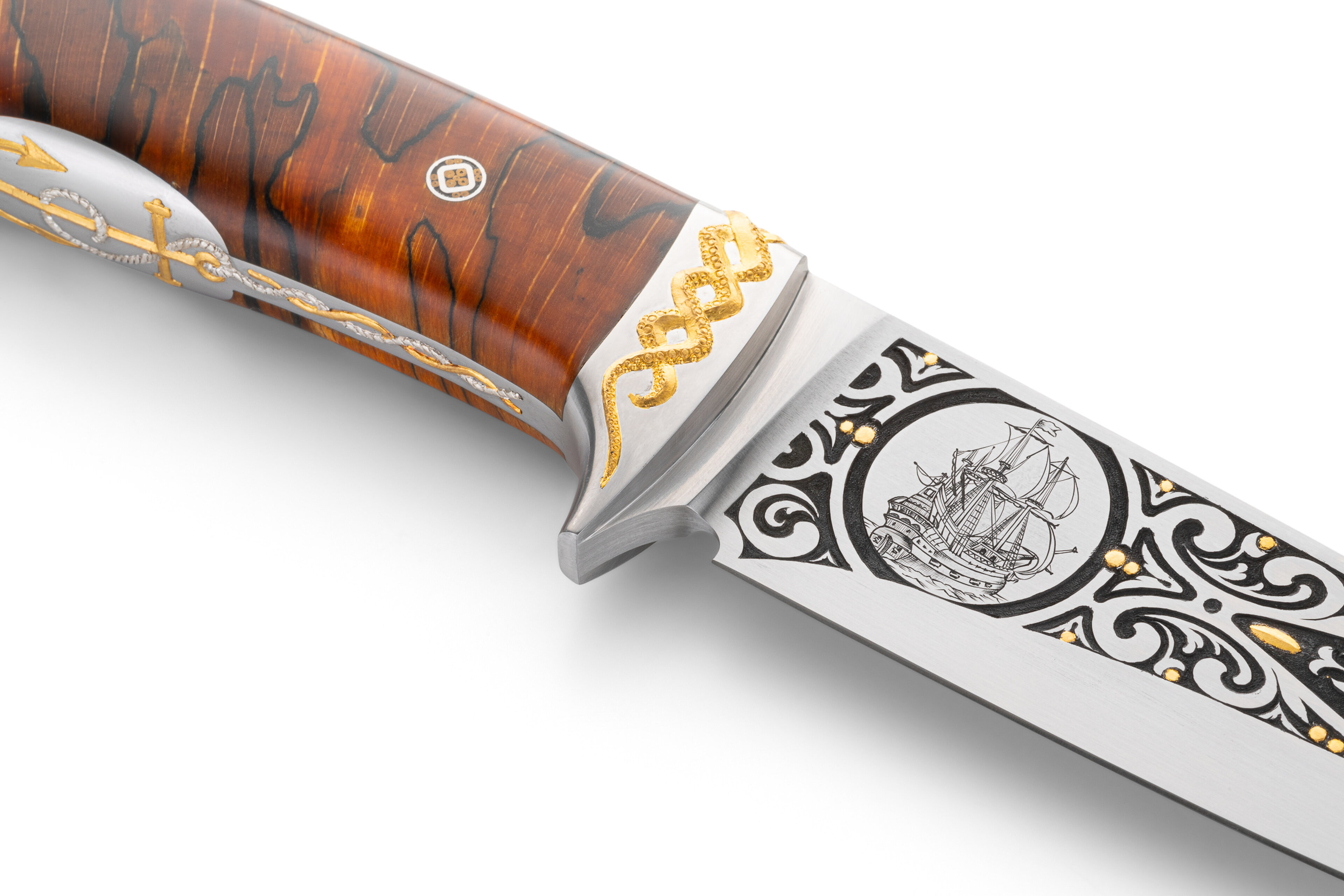 Vollgravur im Thema "Schatzinsel": Aufwändige Gravur der Klinge mit einem Totenkopfmotiv auf der einen und einem Segelschiff auf der anderen Seite. Oktopus als Einlegearbeit aus Gold, über Klingenrücken und Backen. Auf der Oberseite des Erls ein tief gestochener Kompass mit Goldeinlage, auf der Unterseite befindet sich ein Anker aus Gold und Silber. Den Messerabschluss ziert eine plastische Ausarbeitung einer Schatzhöhle.