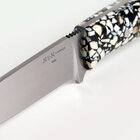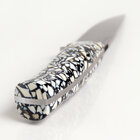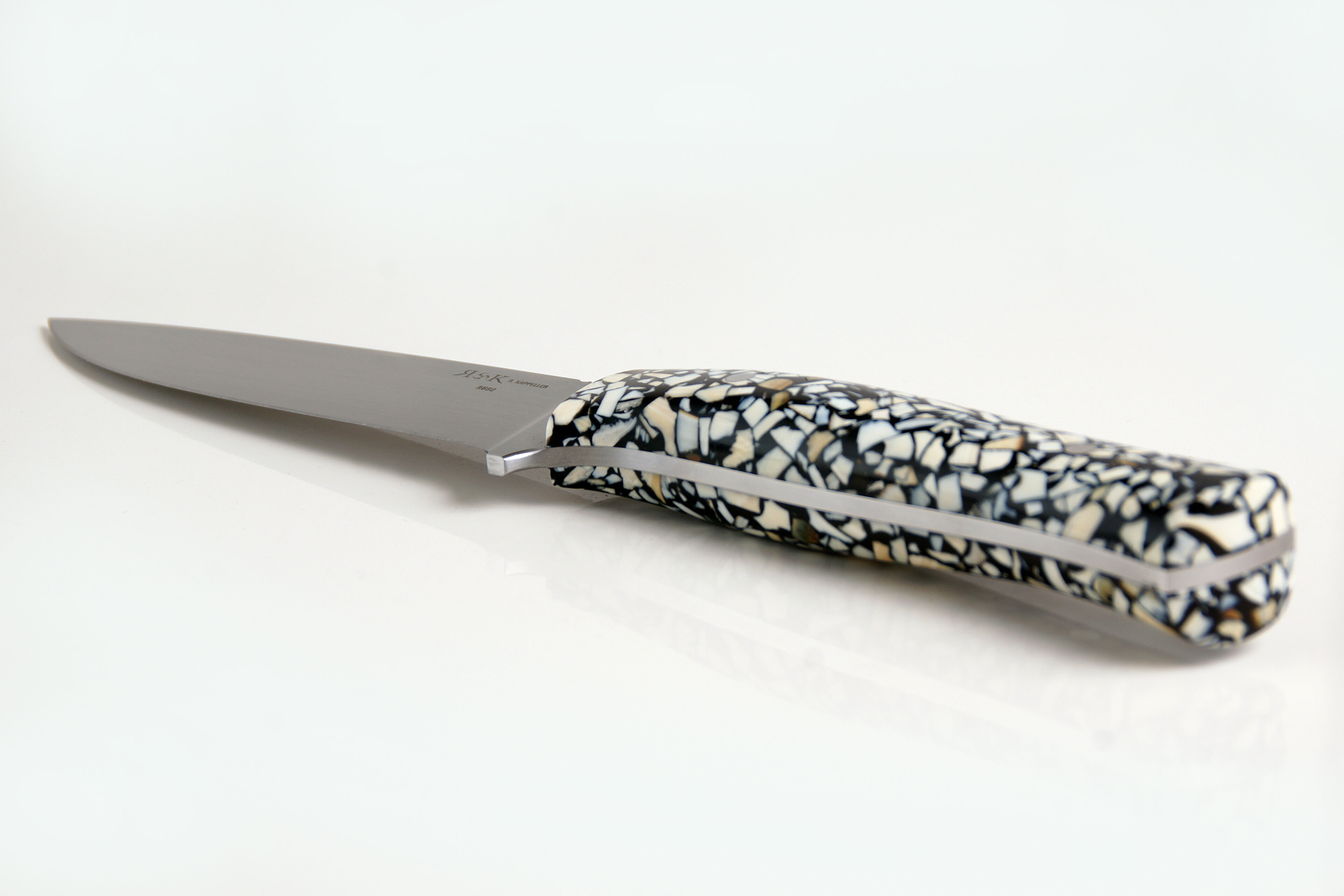 Dieses Griffmaterial besteht aus vielen kleinen Mammutelfenbein-Stücken, die mit schwarzem Harz zu einem Terrazzo-ähnlichen Mosaik vergossen sind.